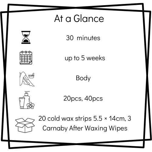 Αποτρίχωση και aftercare, ΤαινίεςCold ready wax strips designed for the body have the ideal size for application on large body areas such as the back, chest, legs, arms and abdomen. Carnaby Body Strips depilatory strips are also suitable for short hair, the results can last up to 4 weeks and the strips are always ready to use without any preparation.