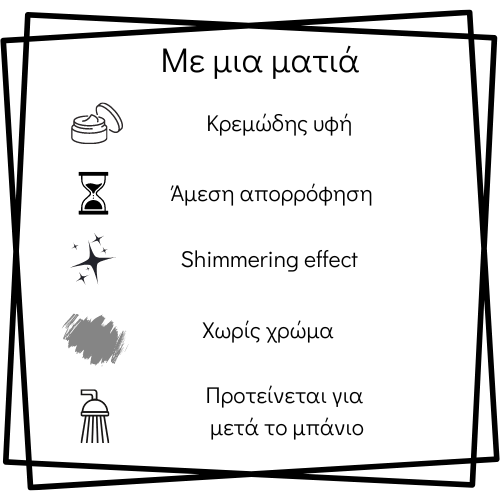 Τα Body Lotion, Body Oil και Body Gel της σειράς Infinity σας γεμίζουν αυτοπεποίθηση, λάμψη και γοητεία μέσα από μία μεγάλη δόση χρυσής πούδρας που μετατρέπει την επιδερμίδα σας σε ένα μέσο ακτινοβολίας ομορφιάς. Η ειδική χρυσόσκονη παράγεται από ορυκτούς παράγοντες χωρίς ίχνη μικρο-πλαστικών και είναι 100% φιλική προς το περιβάλλον και το δέρμα σας.