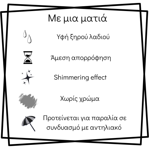 Το Carnaby Infinity – Shimmering Body Oil είναι ένα ξηρό λάδι σώματος με χρυσόσκονη που προσφέρει στο δέρμα σας άμεση λάμψη και ενυδάτωση αφού δρα στο άνω στρώμα της επιδερμίδας και εγκλωβίζει την φυσική υγρασία της. Αφήνει μια μεταξένια απαλή αίσθηση χωρίς να είναι λιπαρό και έχει μακρά διάρκεια κάτω από τον ήλιο της παραλίας και το θαλασσινό νερό. Το Carnaby Infinity – Shimmering Body Oil συνδυάζει βιταμίνη Ε και λάδι αλόης προσφέροντας στο δέρμα σας την απαραίτητη φροντίδα που χρειάζεται ακόμα και υπό το φως…του φεγγαριού!