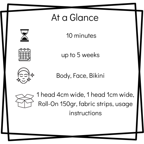 Διαθέτει 2 κεφαλές που βιδώνουν πάνω στο δοχείο με το κερί, μια φαρδιά και μια λεπτή οι οποίες βοηθούν είτε να το απλώσετε γρήγορα σε μεγάλη επιφάνεια ή να το απλώσετε με ακρίβεια σε μικρή επιφάνεια. Απαλλαγείτε λοιπόν από ανεπιθύμητη τριχοφυΐα ή διαμορφώστε το σχήμα που θέλετε με ακρίβεια, η επιλογή δική σας